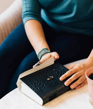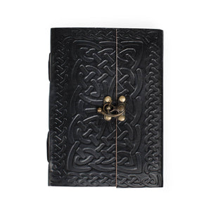 Handmade paper journal with embossed black buffalo leather cover and brass clasp closure - 5Wx7Hx1D - +/- 90 sheets; 180 pages - Unlined - Handmade in India
