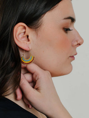 These colorful earrings feature delicate gold detailing with enamel painted rainbows. Perfect for those indecisive days-- why pick a color when you can wear them all!