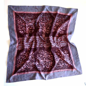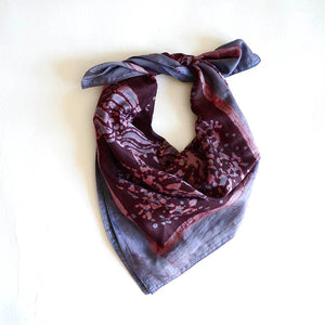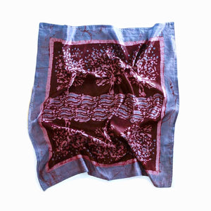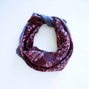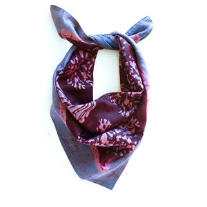 This beautiful bandana features a nature inspired design, hand block printed on a luxurious cotton-silk blend. Hand dyed in deep purple with accents of mulberry, pink, and lavender, the Reflection design merges traditional craftsmanship with an elegant, contemporary touch.