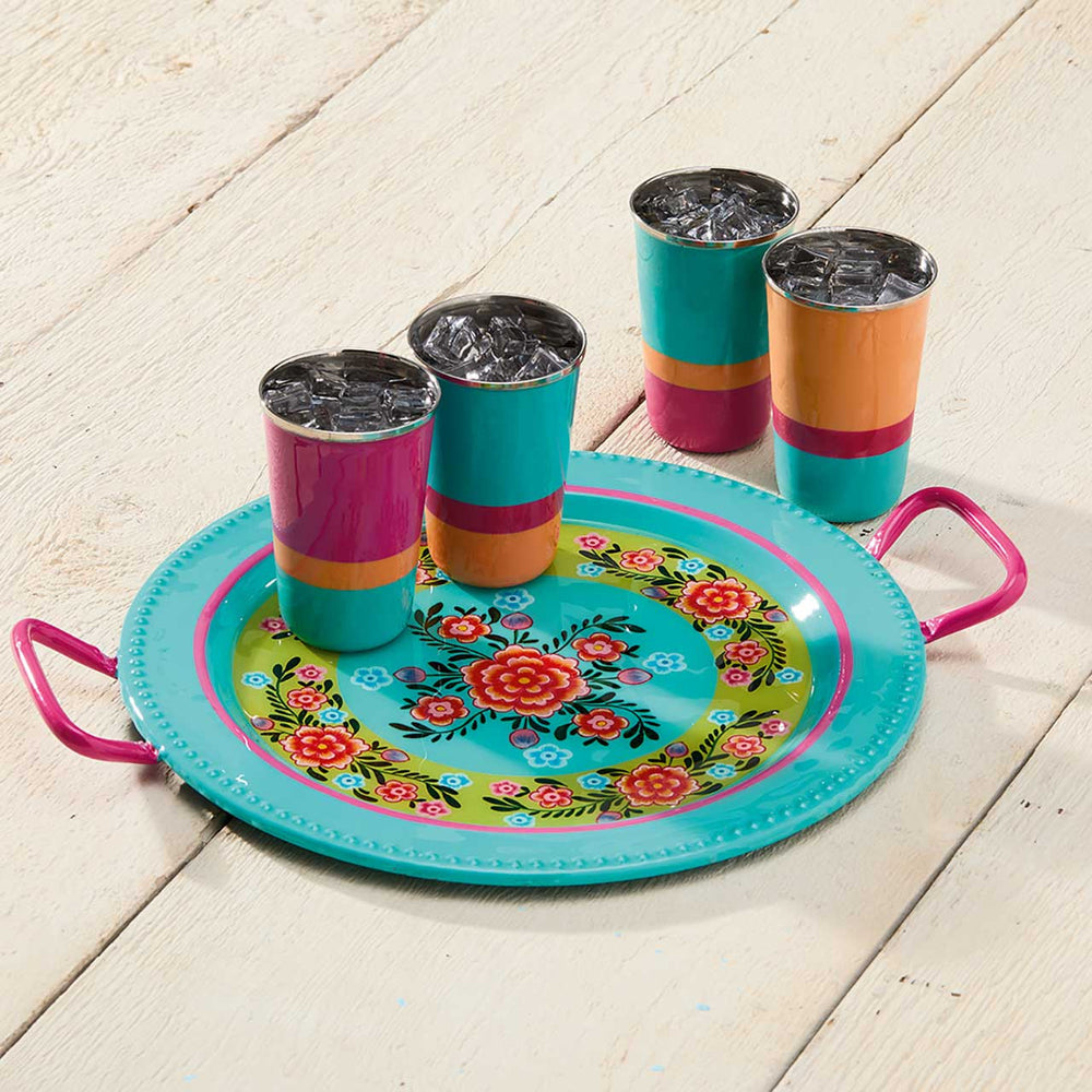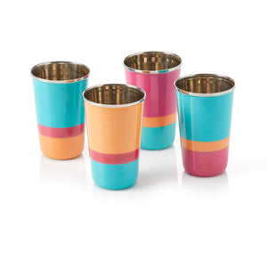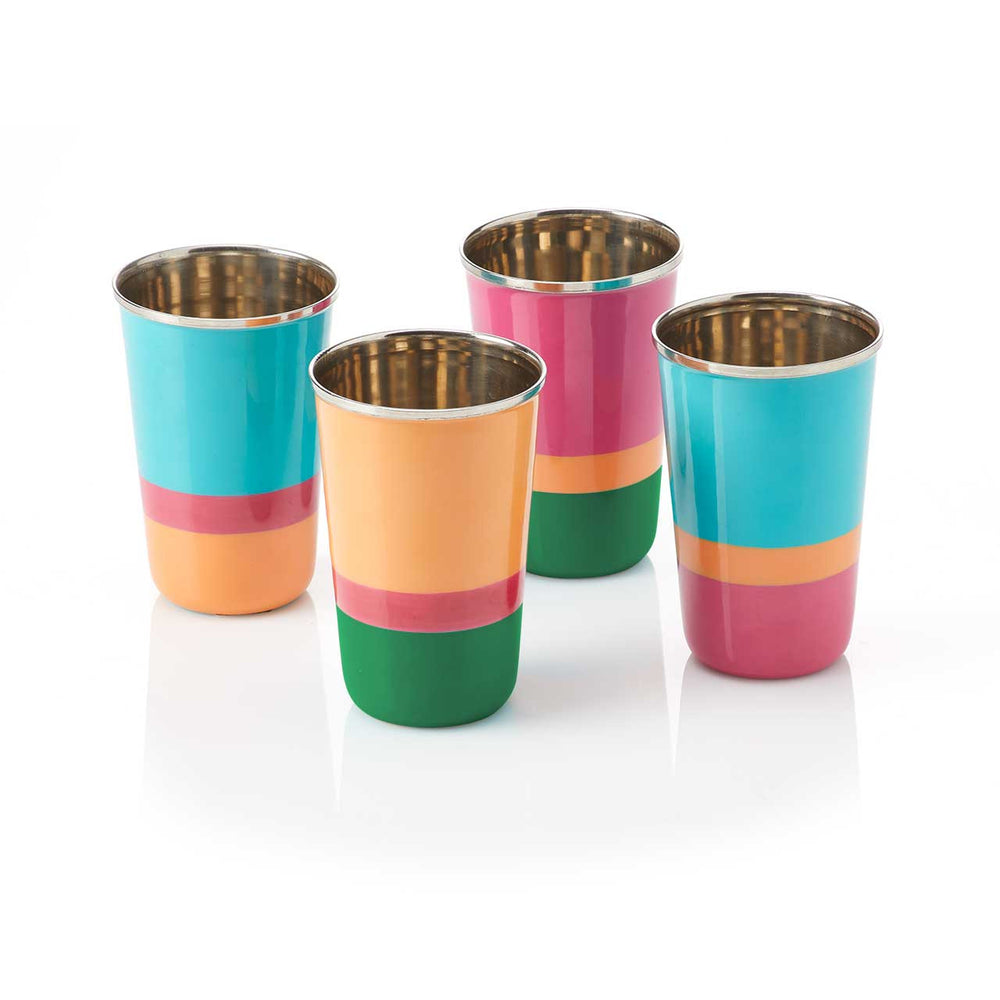 Perfect for iced tea, lemonade, or your favorite cold beverage, these colorful cups are a must for any entertainer. Each cup is made from durable stainless steel, which is covered in bright enamel stripes of pink, orange, emerald, and aqua, and coated in a food-safe finish. Also great for camping and picnics!